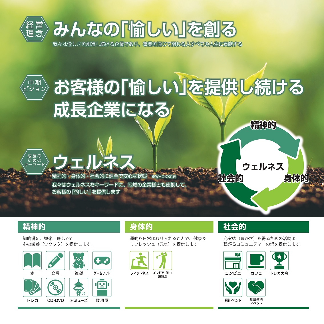 我々は時代のニーズに適した変革を続け、みんなの『愉しい』を創り、そこに集まるお客様、従業員やその家族がより心身共に豊かになる、そのような場を提供し続るよう、邁進してまいります。